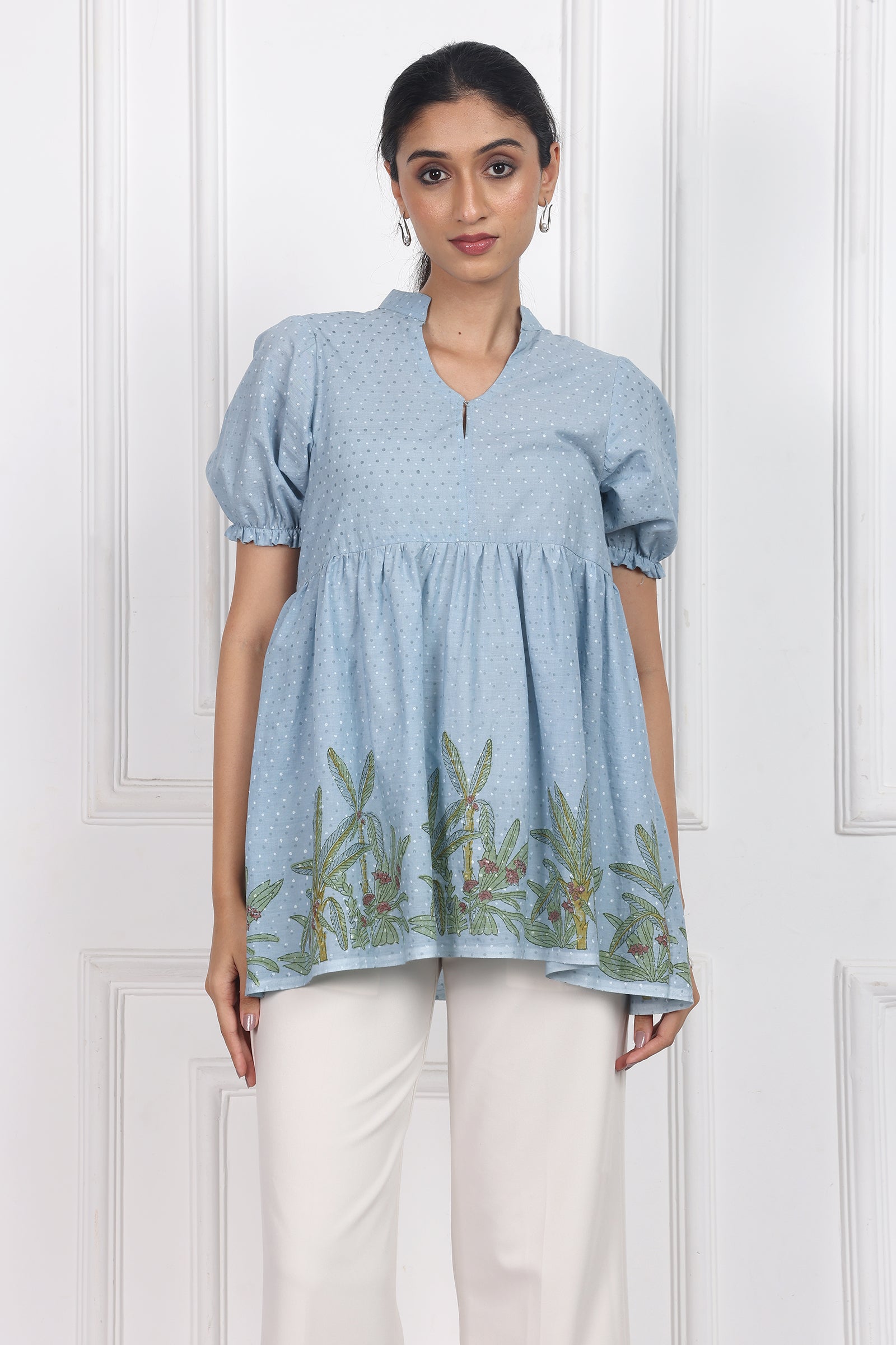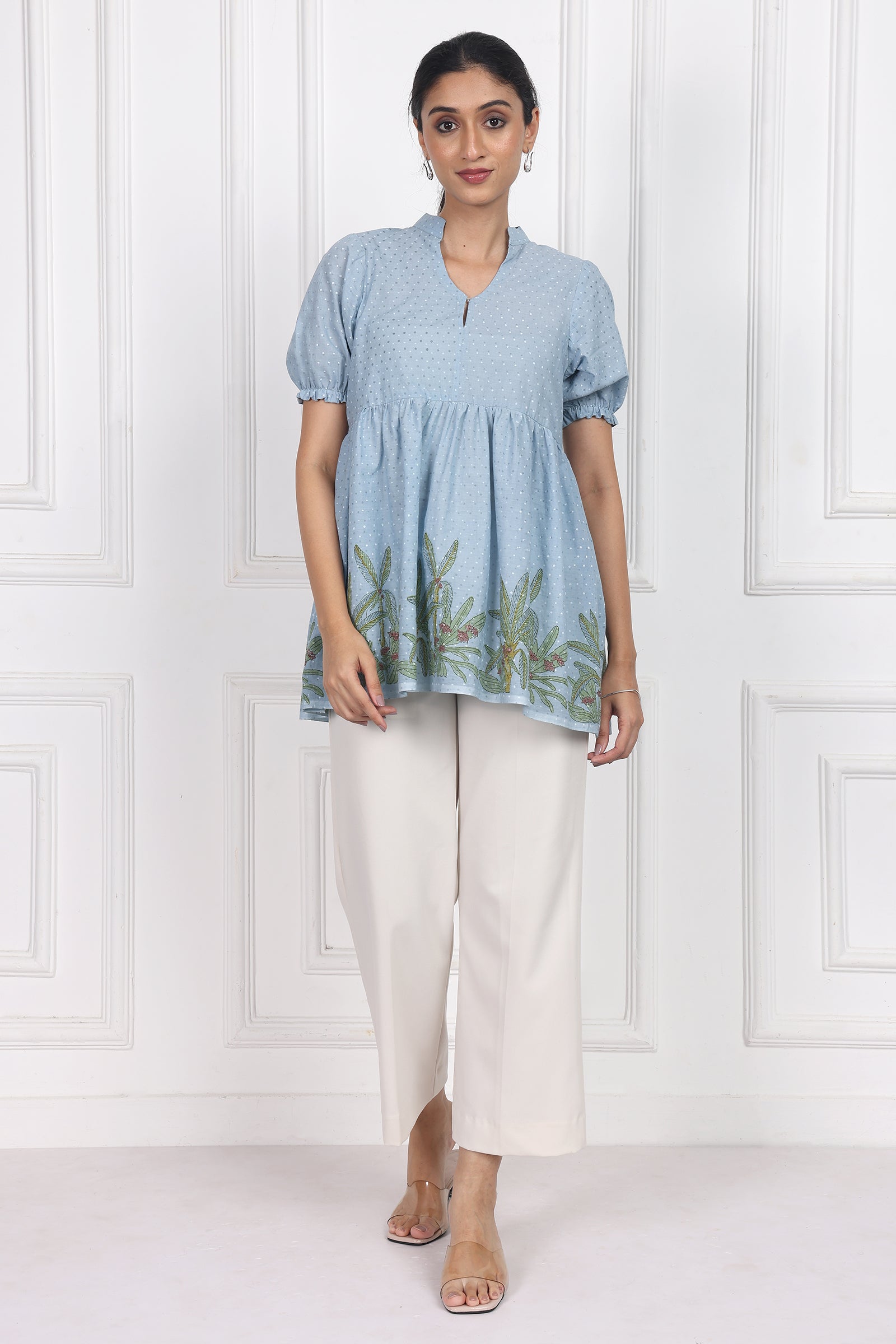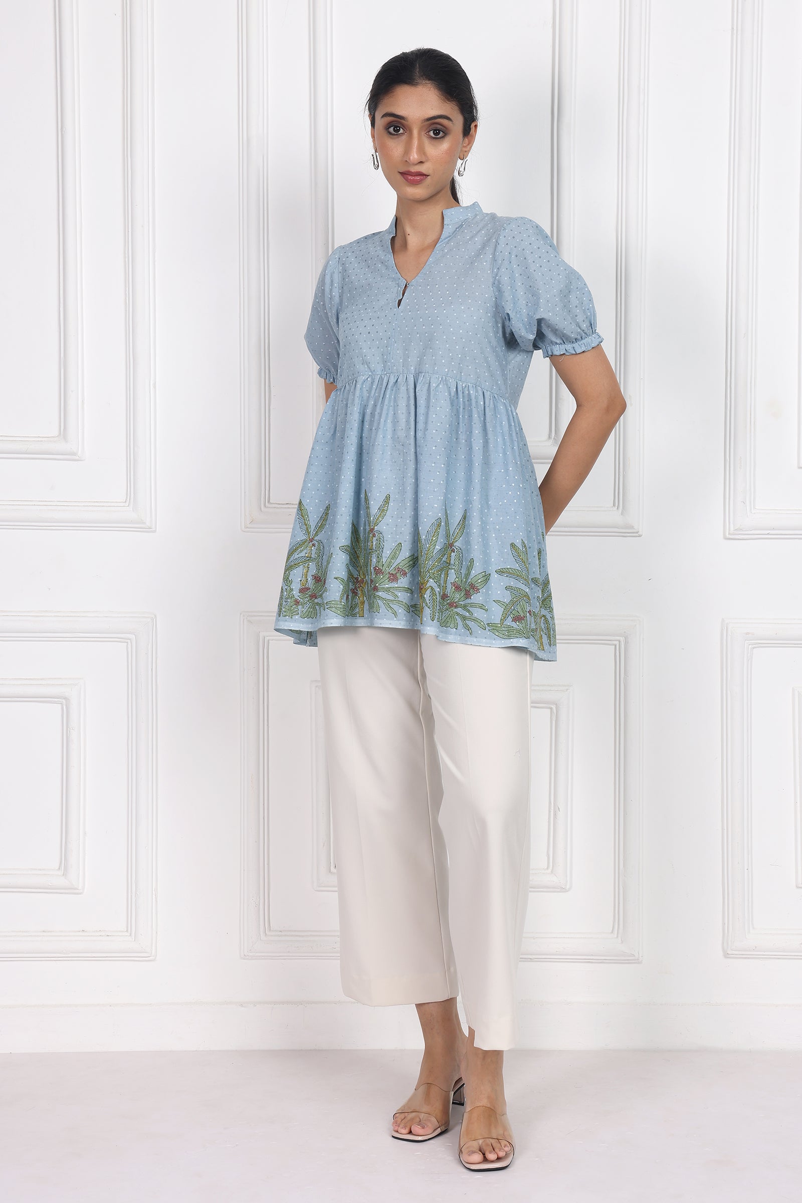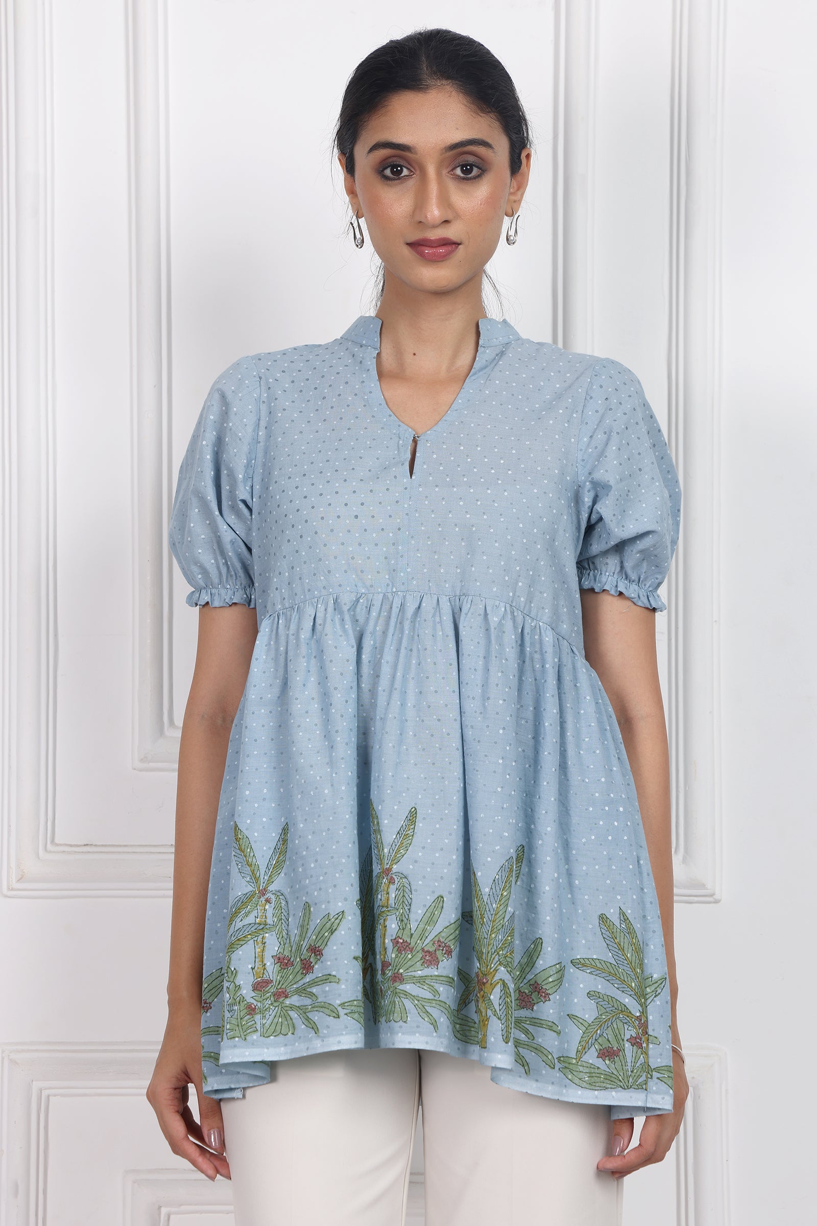 Handblock printed cotton peplum top with a flattering flare, blending traditional craft with modern style.